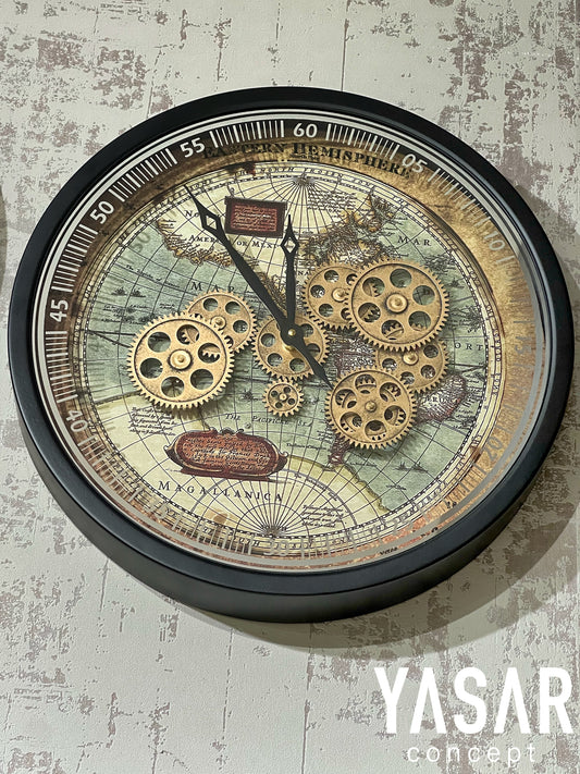 Maphoris Dünya Haritalı Metal Çarklı Duvar Saati 46 Cm