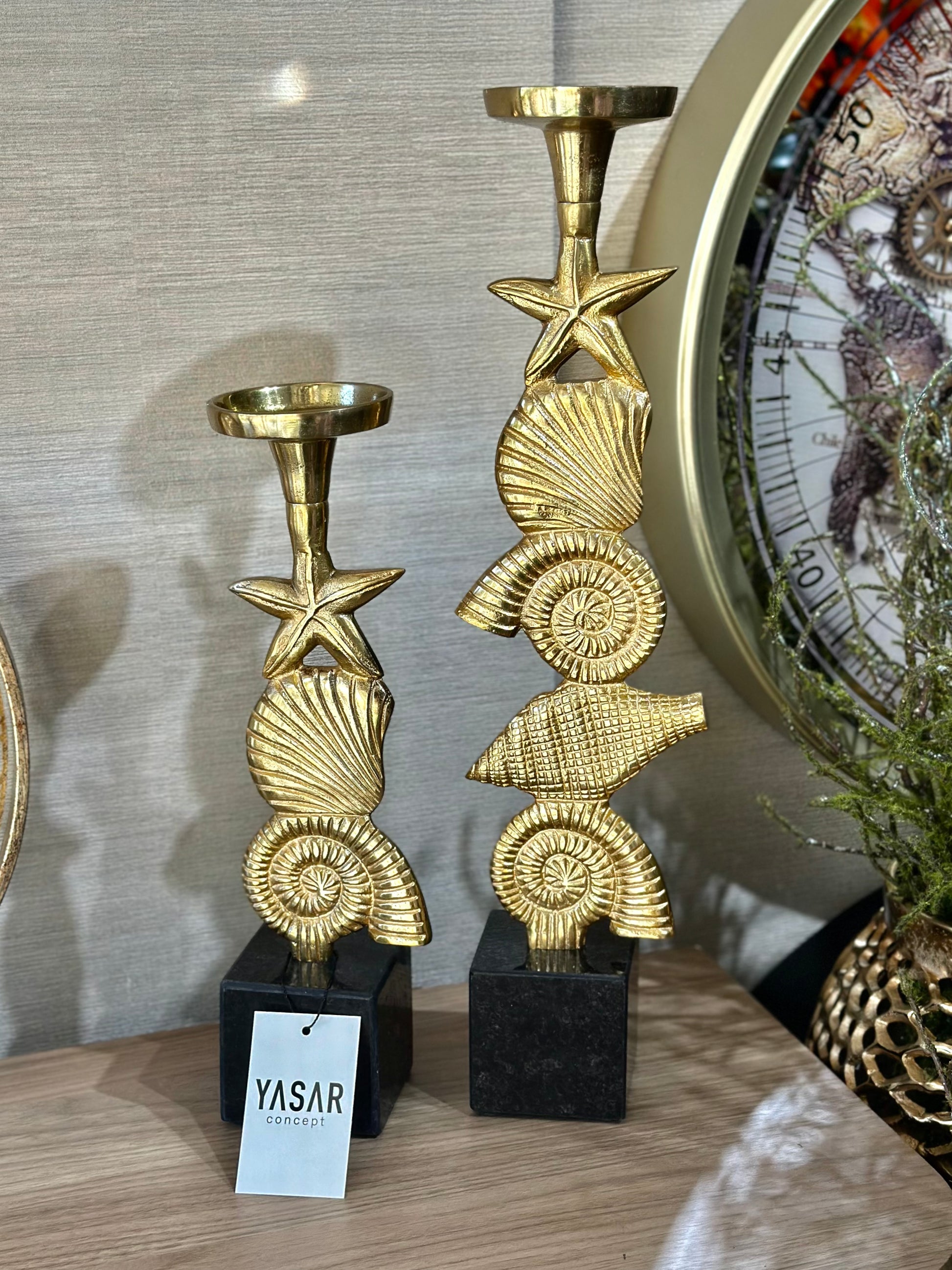 Set olarak sunulan bu ikili mumluk, deniz temalı dekorasyon sevenler için etkileyici bir seçimdir. Özellikle yazlık evlerde, sahil esintili yaşam alanlarında ya da marin tarzı detayların öne çıkarılmak istendiği alanlarda dekoratif gücünü ortaya koyar. Metal gövdesi, sağlam ve uzun ömürlü kullanım sunarken; zarif formlu kabuk figürleri göz dolduran bir işçilikle modellenmiştir.