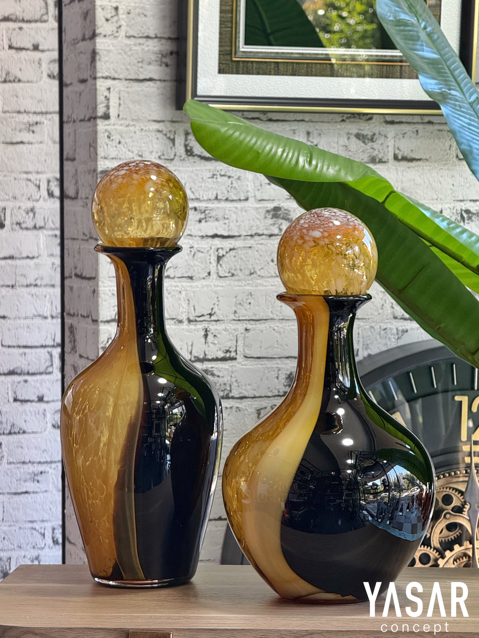 İster konsol üstü dekorasyonlarında ister banyo, mutfak veya raf düzenlemelerinde tercih edilebilecek bu özel set, sade ama etkileyici bir atmosfer yaratmak isteyenler için birebirdir. Amber rengin sıcaklığı ile siyahın güçlü duruşu bir araya geliyor; evinizde dengeli, lüks ve özgün bir hava estiriyor.
