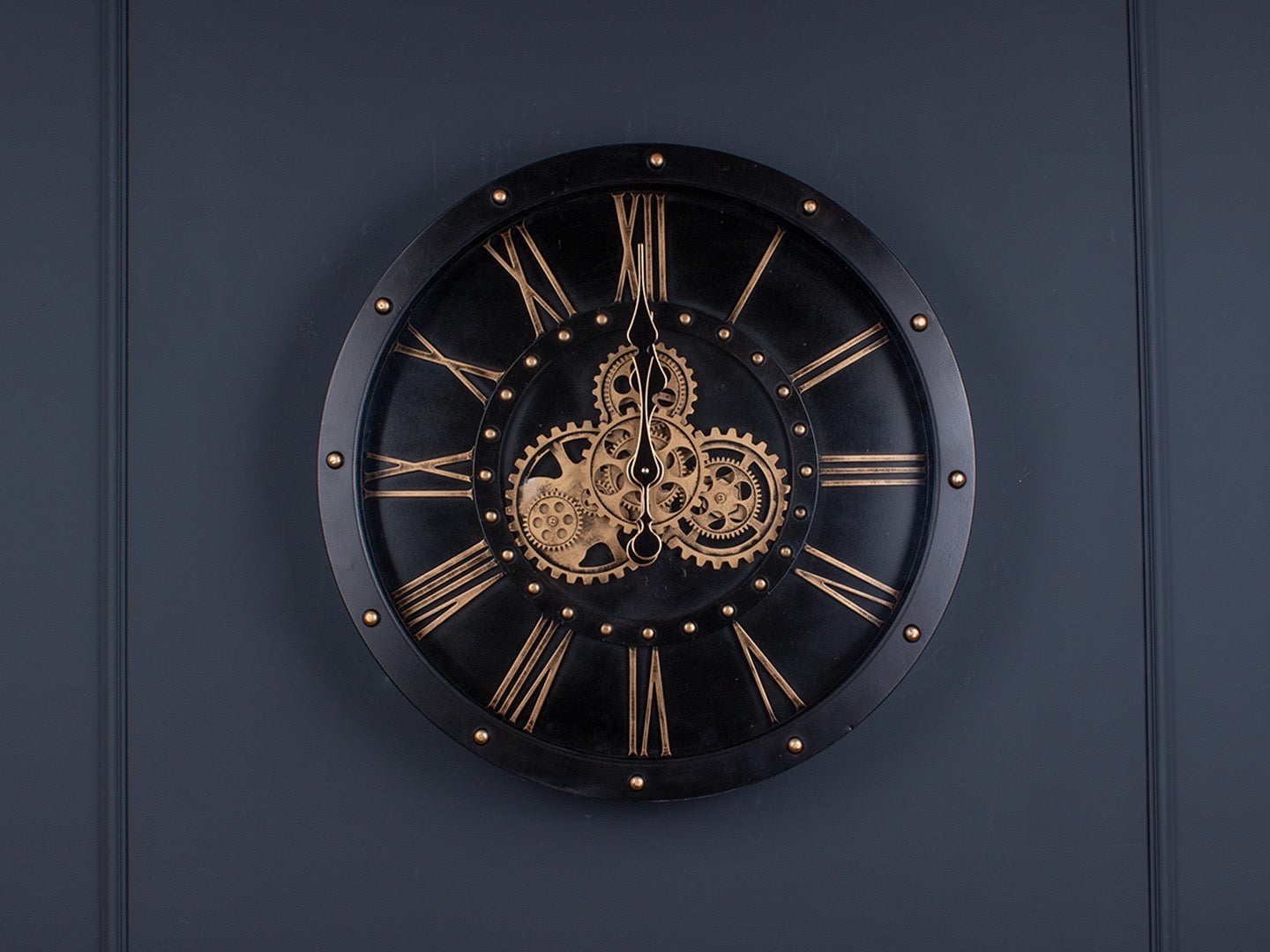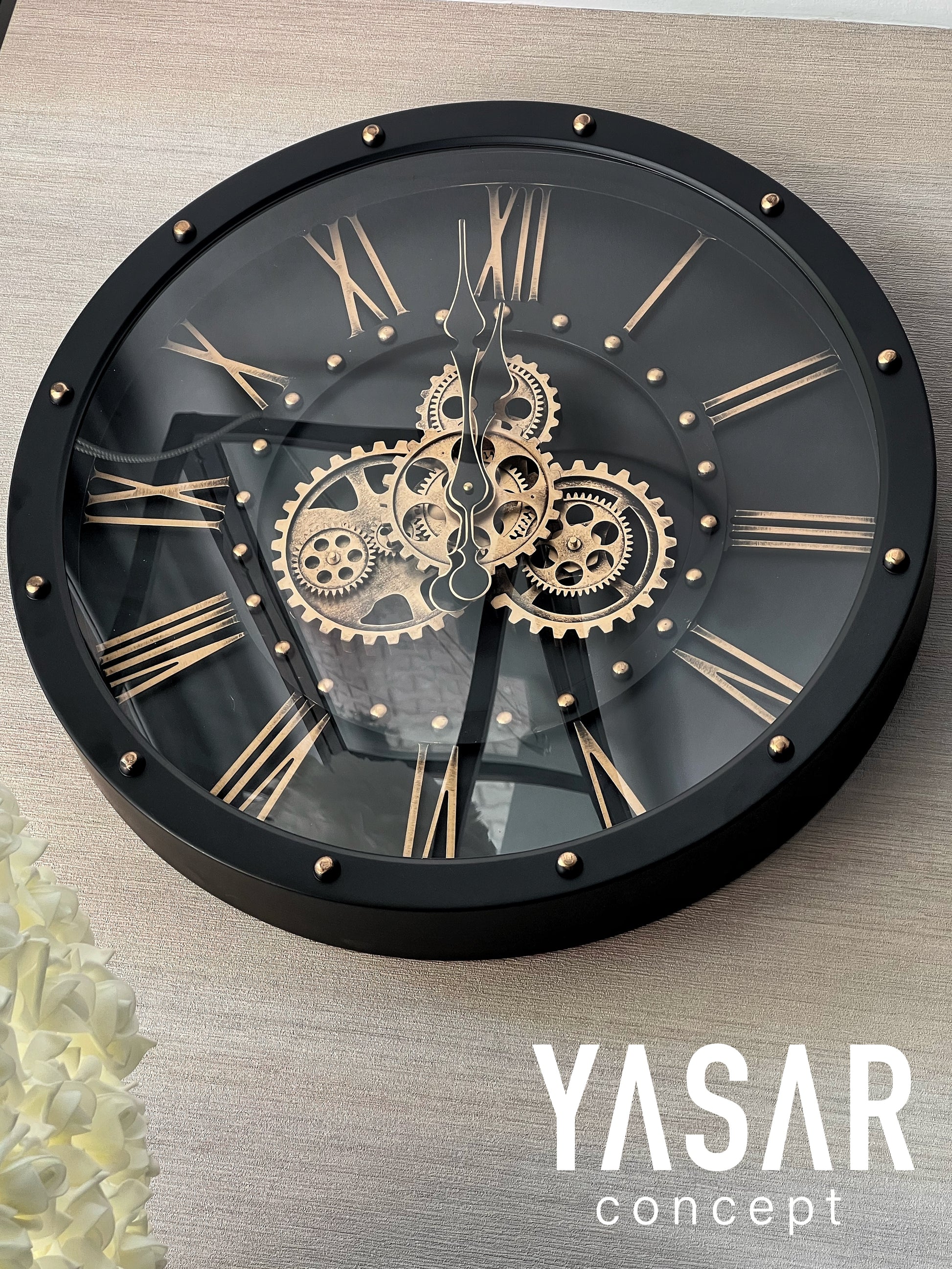 Blackora Metal Çarklı Duvar Saati, siyah mat gövdesi ve iç kısımdaki altın tonlu çark mekanizmasıyla zarafeti endüstriyel detaylarla birleştiriyor. 60 cm çapındaki bu saat, Romen rakamlı gösterimi ve merkezdeki dekoratif çark sistemi ile hem şık hem güçlü bir duruş sunar.