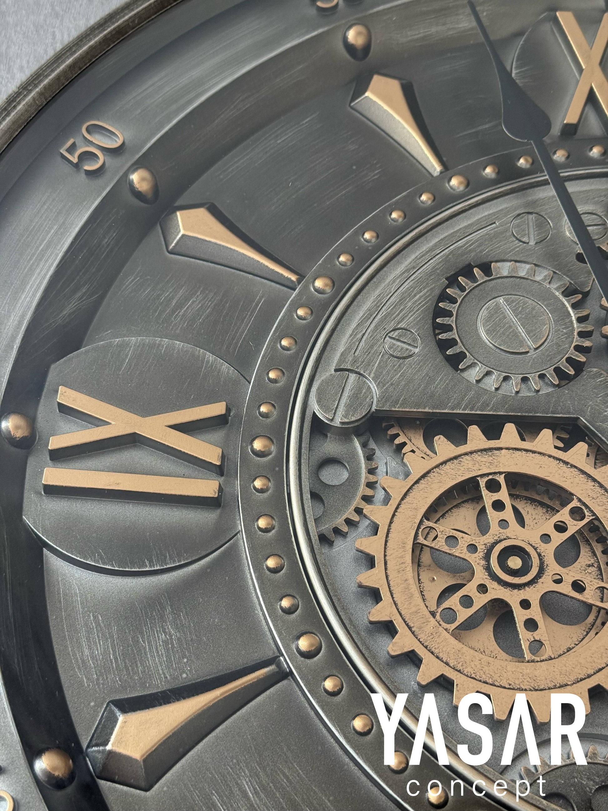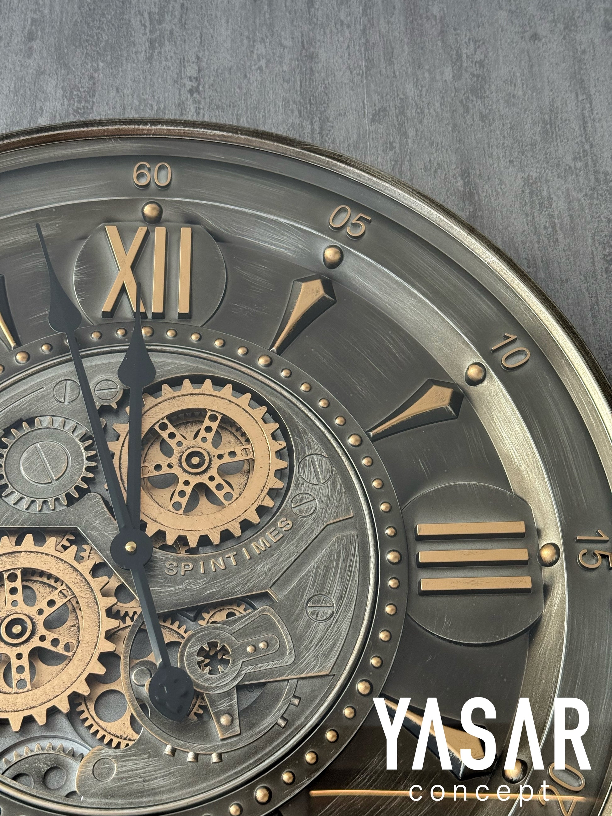 Bu saat, iç mekanlarda güçlü ve modern bir vurgu yaratır. Mekanik estetiği öne çıkaran çark yapısı, hem endüstriyel hem de çağdaş dekor stillerine kolayca uyum sağlar. Yaşam alanlarınızda zaman kavramını stil sahibi bir biçimde yansıtmak isteyenler için ideal bir tercih.
