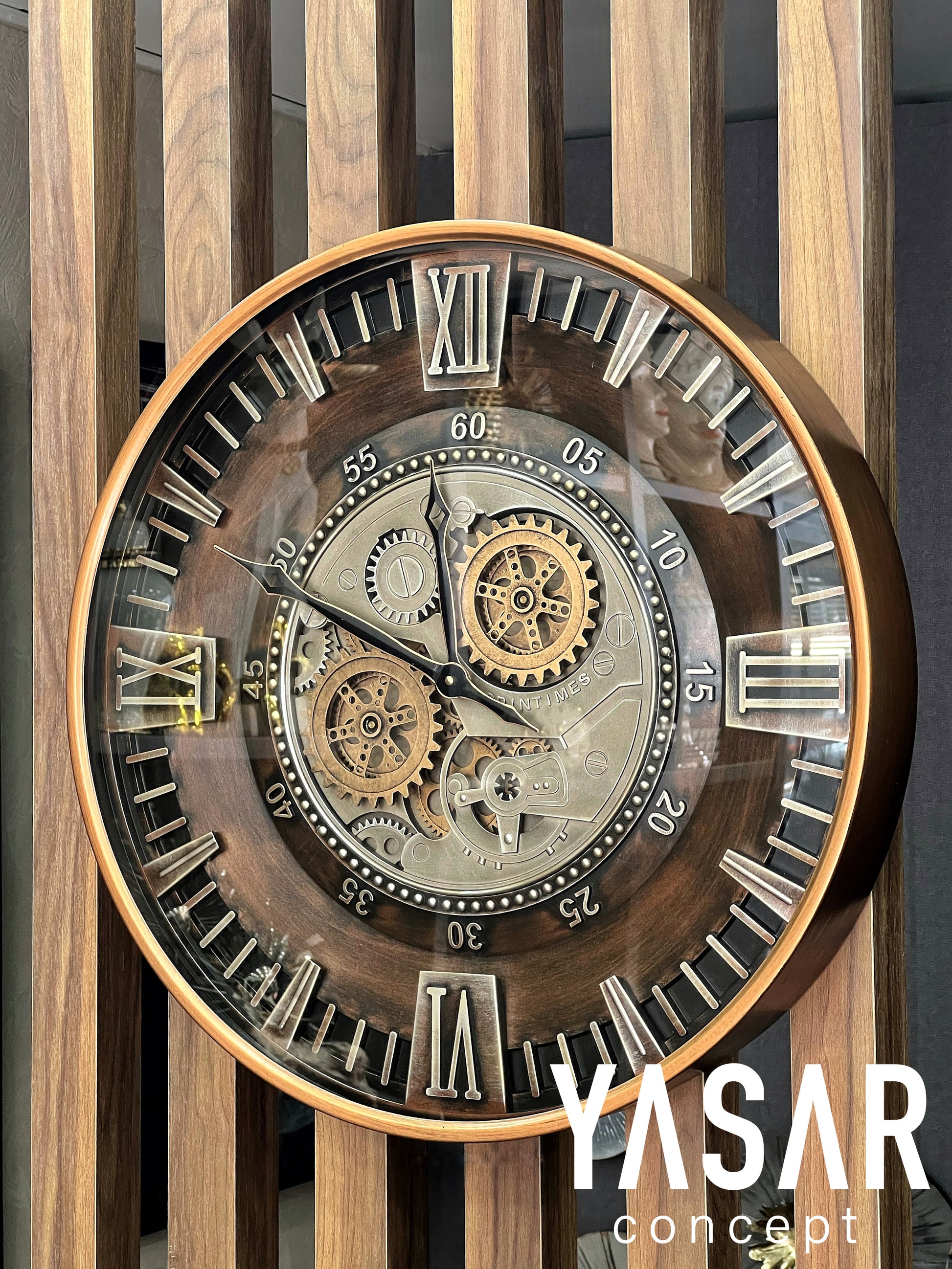 Yüksek kaliteli metal çarklar ve şık gümüş-gold detaylar, bu duvar saatini sıradan bir zaman ölçüm aracından öteye taşıyarak, modern yaşam alanlarınızı güzelleştiren bir dekoratif öğeye dönüştürür. Sıcak kahve tonları, saatin nostaljik bir hava katmasını sağlarken, gümüş ve altın renklerindeki çarklar ise ona sofistike bir görünüm kazandırıyor.