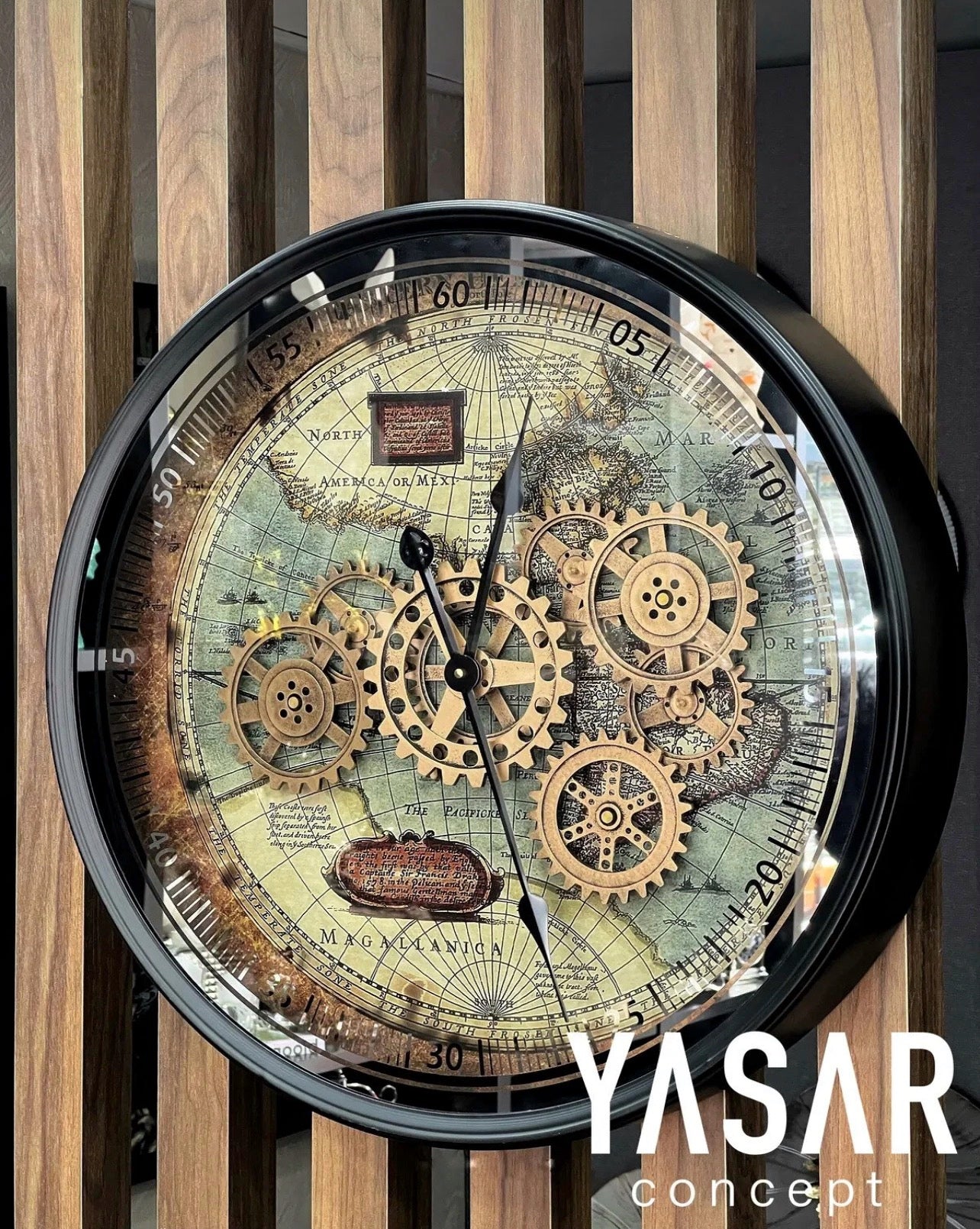 Yüksek kaliteli metal ve özenle işlenmiş harita tasarımı ile üretilen bu dişli saat, uzun ömürlü kullanım sunarken, dayanıklı yapısıyla yıllarca dekorasyonunuzu tamamlar.