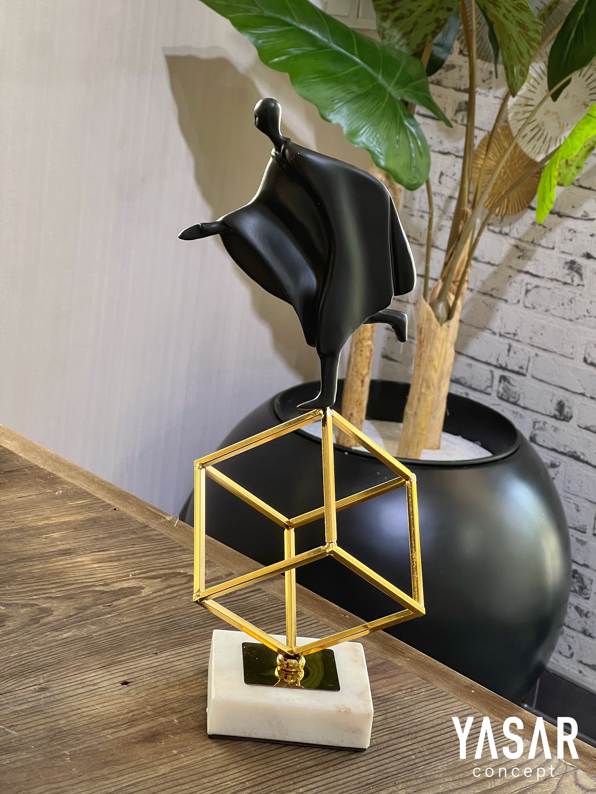 Altın rengindeki metal gövde, figürün dinamizmini vurgularken, beyaz mermerin zarafeti ve siyah figürün sofistike duruşu, mekânınıza derinlik ve anlam katıyor. Hem ofislerde hem de ev dekorasyonunda özgün bir detay olarak kullanılabilir.
