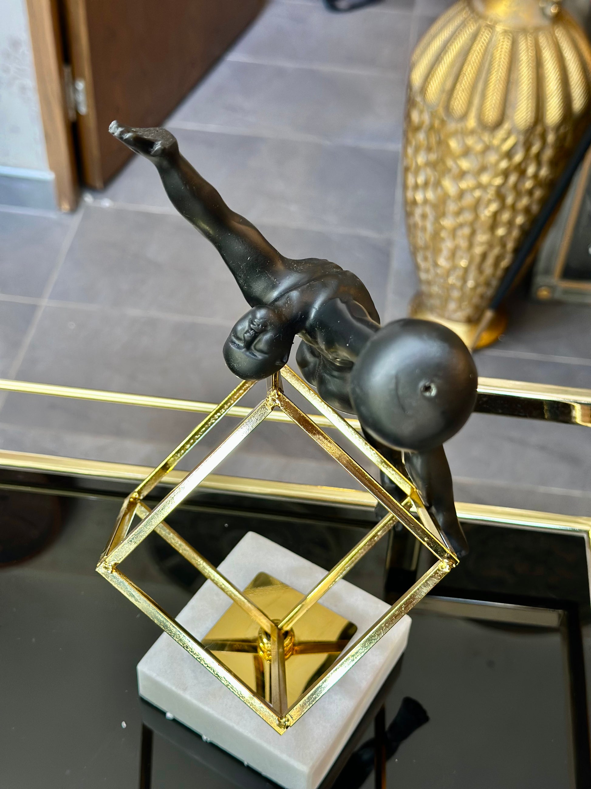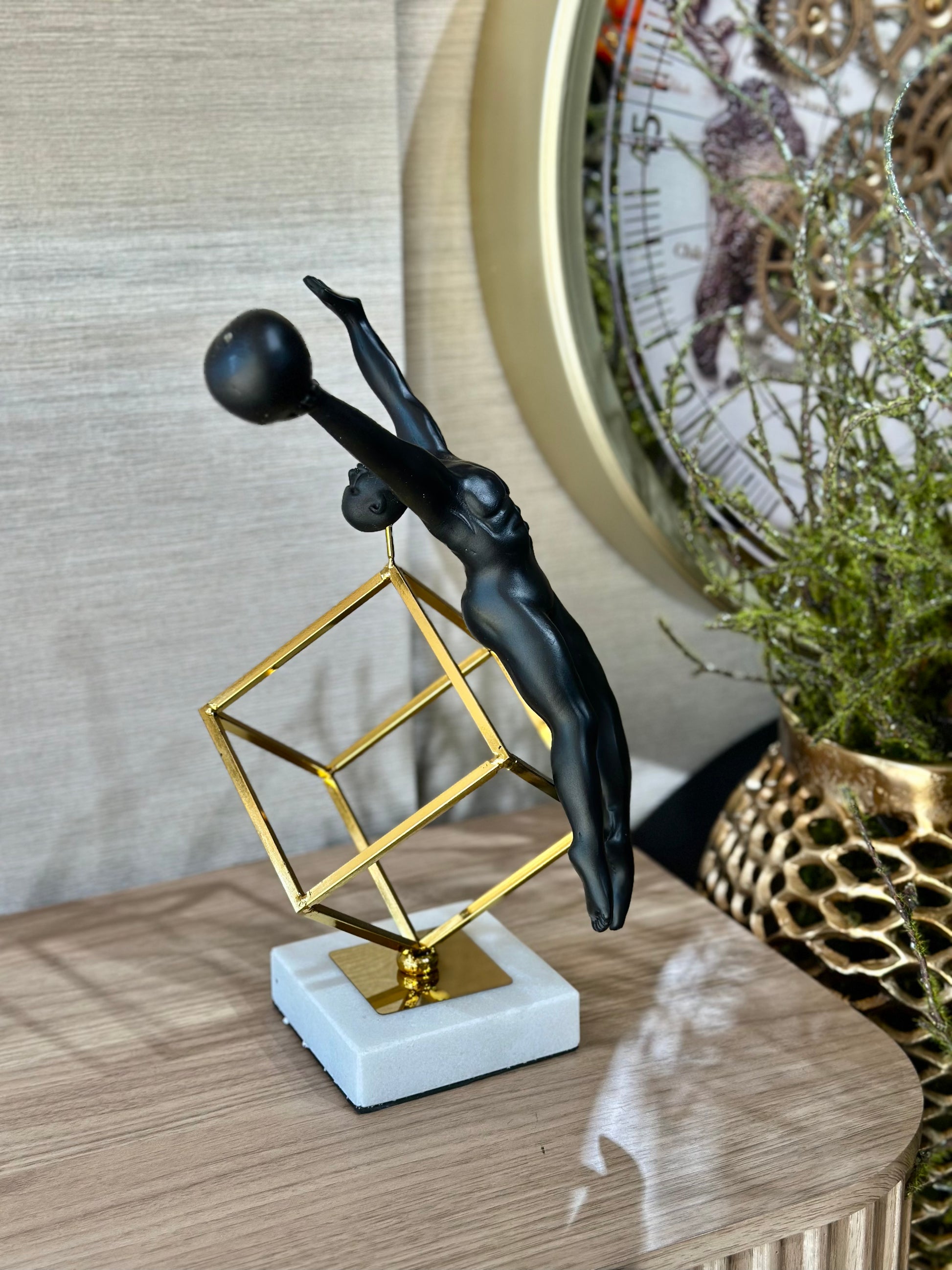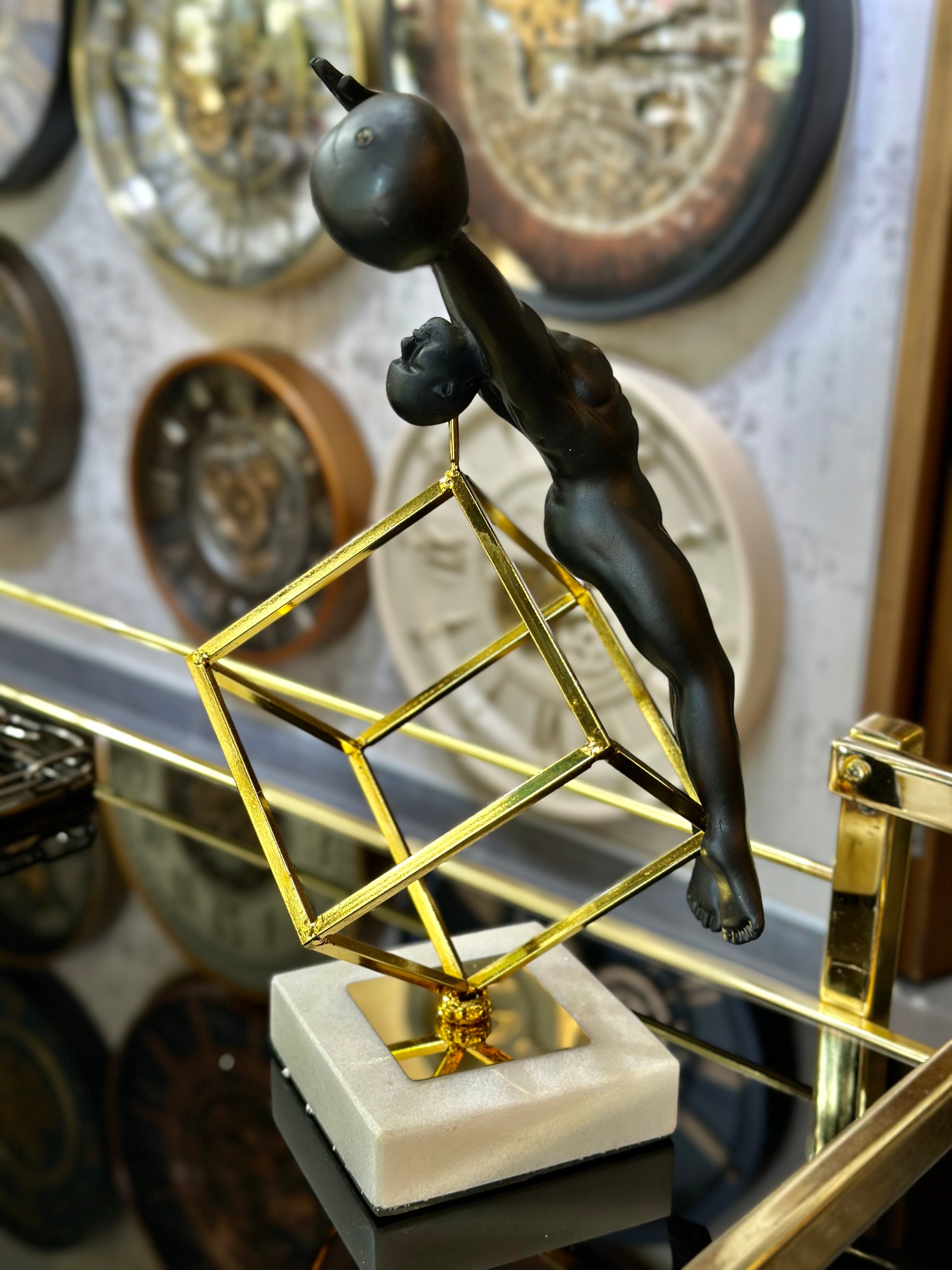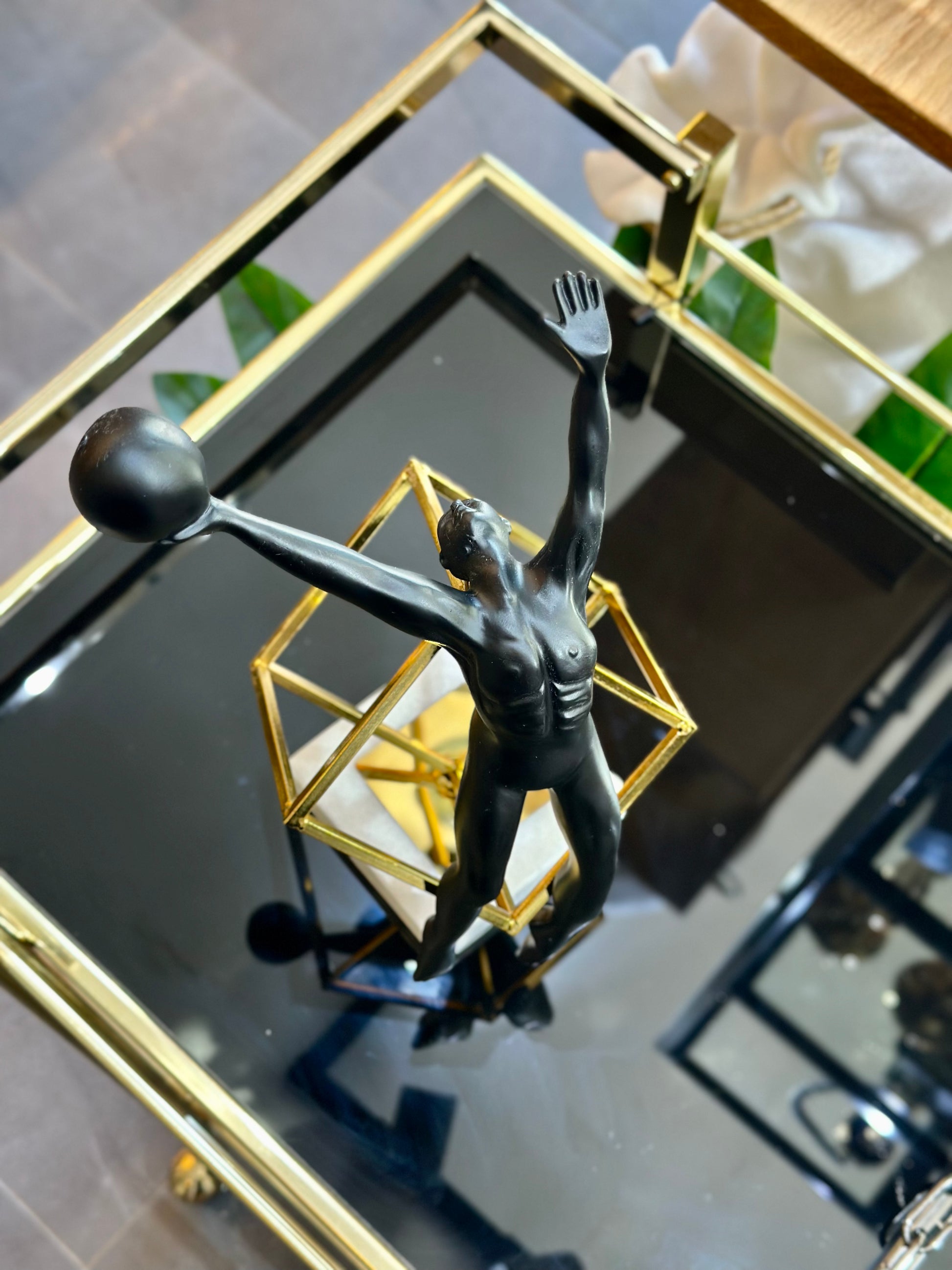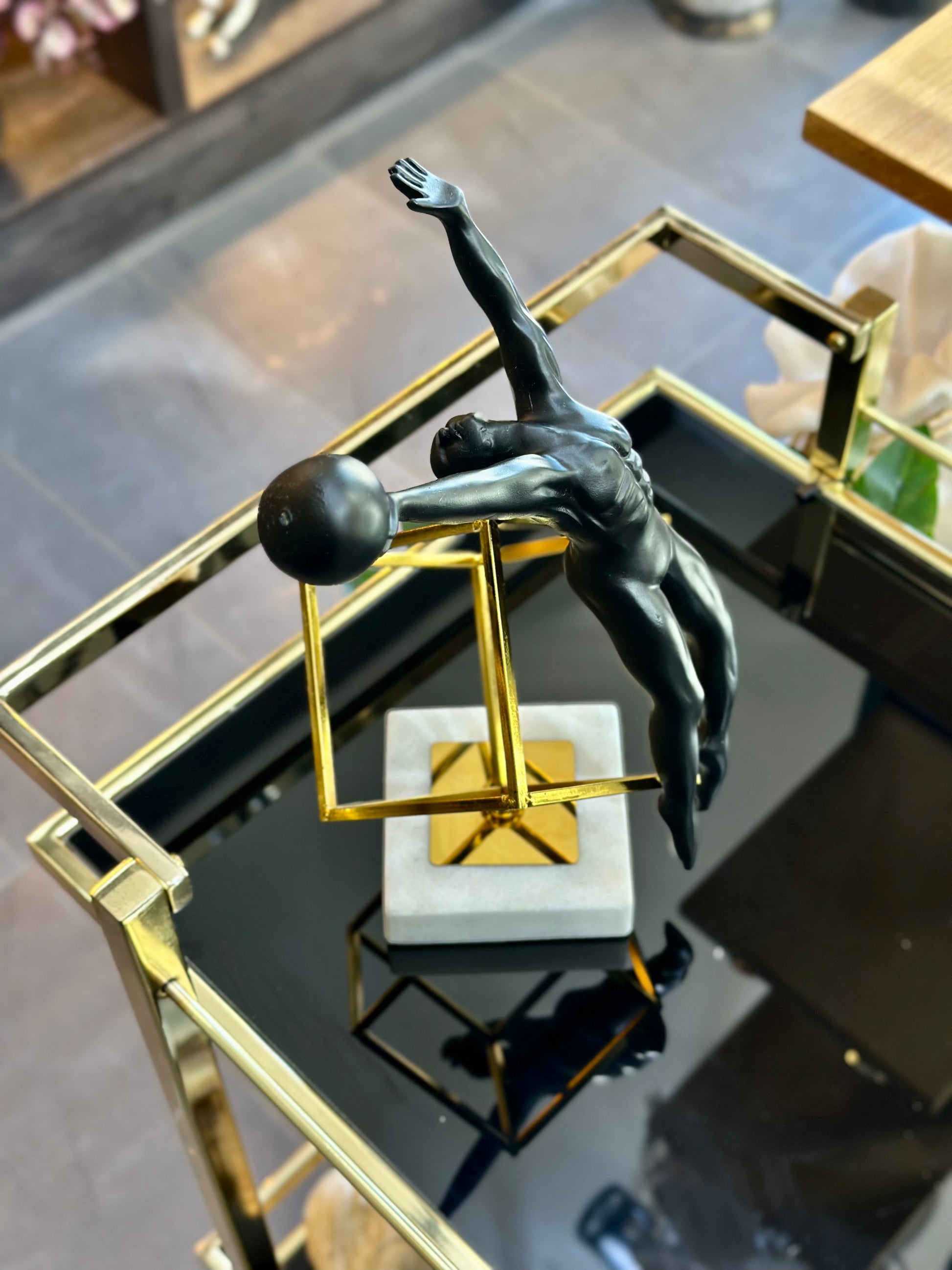 Altın metal gövde, sporcu figürünün hareketini ve enerjisini vurgularken, beyaz mermerin zarafeti ve siyah polyresin figürün modern dokusu, her ortamda dikkat çekici bir odak noktası oluşturur. Hem ofislerde hem de evlerde, şıklığı ve gücü yansıtan bu obje, dekorasyonunuzu mükemmel bir şekilde tamamlar.