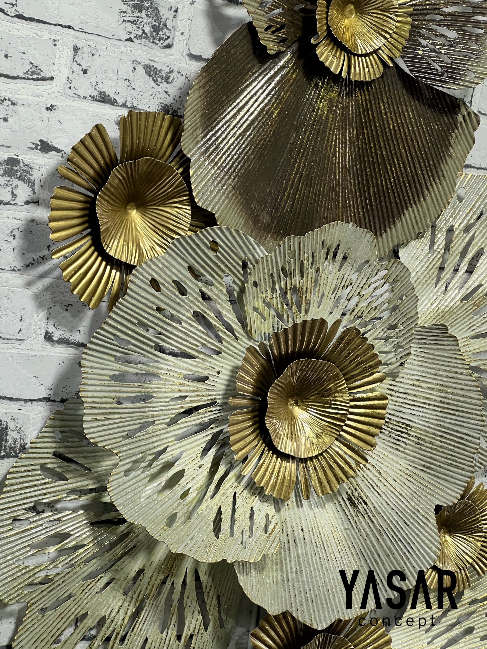 Glidafleur Metal Duvar Panosu, doğadan ilham alan tasarımıyla yaşam alanlarınıza zarif bir estetik sunar. Gold metal yapraklar ile çevrelenmiş beyaz çiçek formları, panoya hem romantik hem modern bir karakter kazandırır. 60x135 cm ölçüsü sayesinde ister yatay, ister dikey olarak konumlandırılabilir ve duvarınıza göre esnek bir kullanım sağlar.