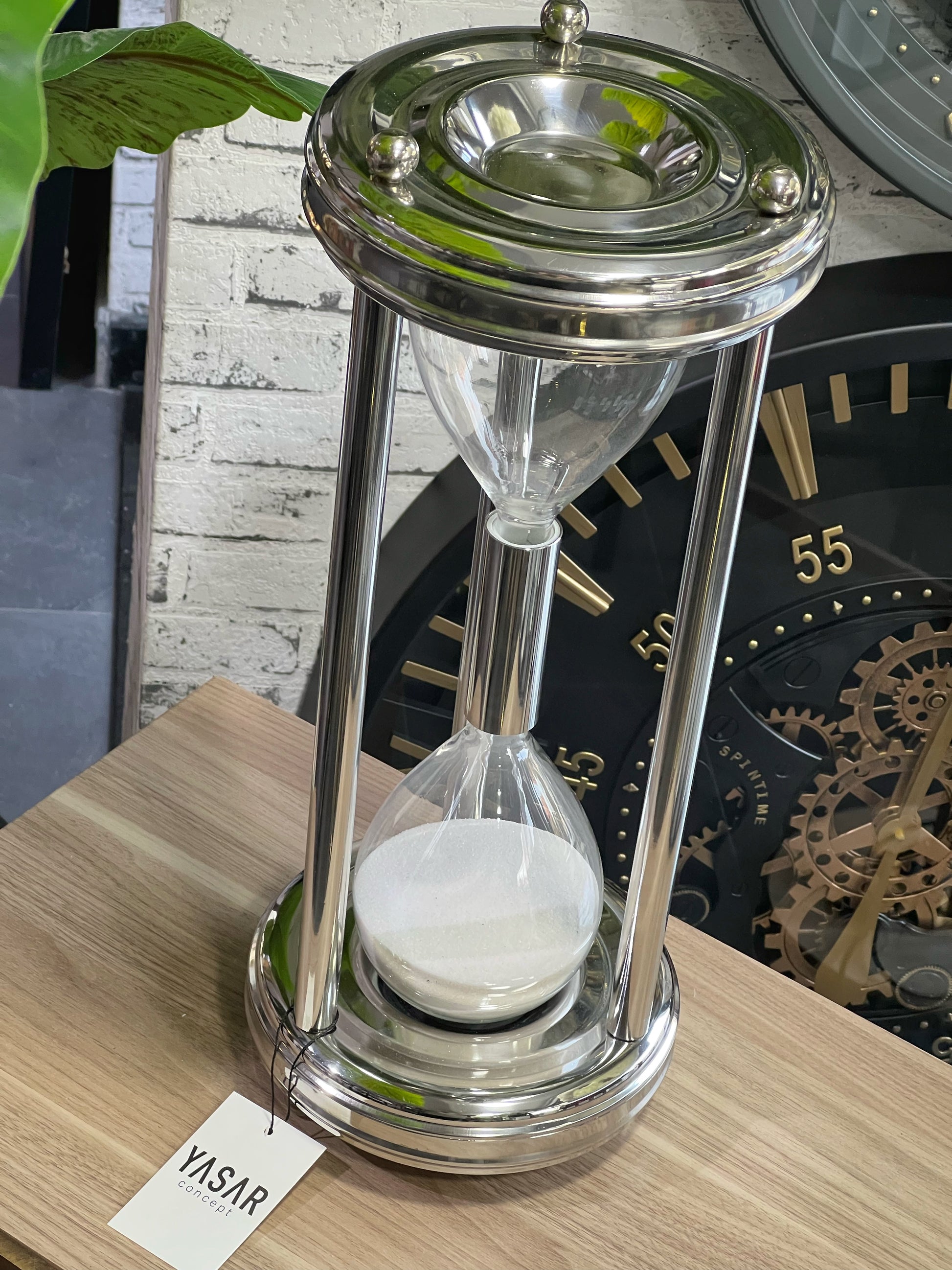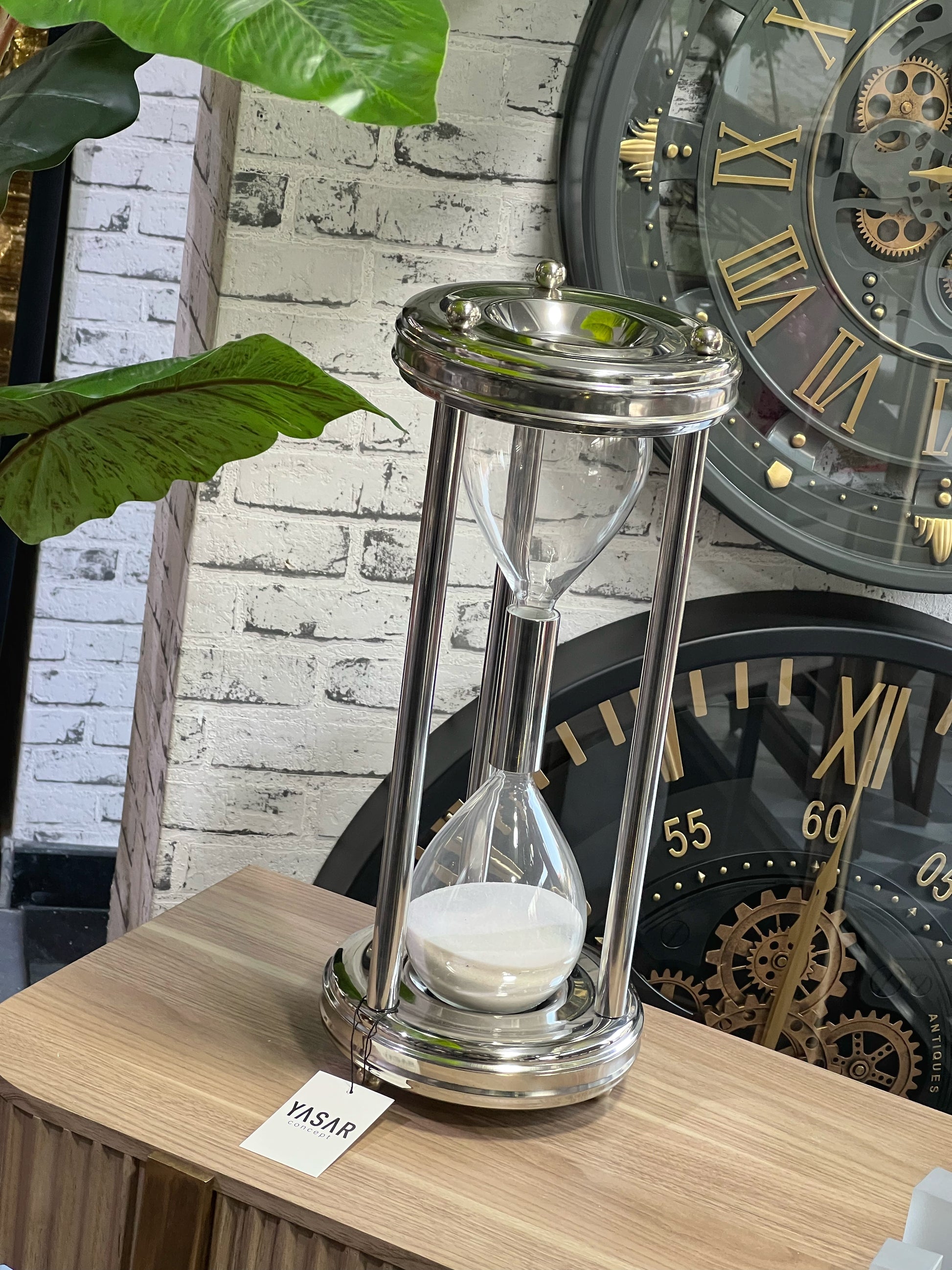 Büyük boyutu ve sade şıklığıyla dikkat çeken gümüş metal kum saati, dekoratif aksesuar severler için zamansız bir seçimdir. Minimal tarzla klasik duruşu buluşturan bu kum saati, yaşam alanlarınıza sakinlik ve zarafet katmak için tasarlandı.