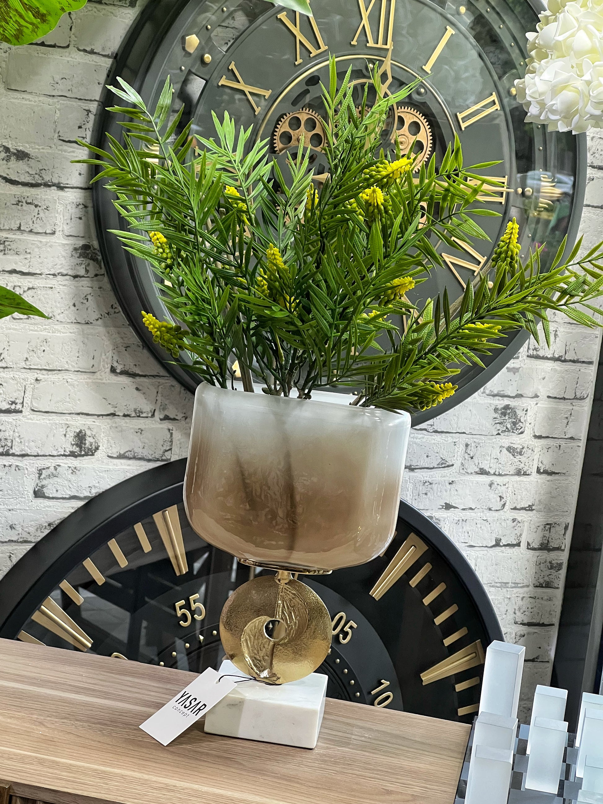 Lustrina Dekoratif Vazo, altın metal daire detayı, mermer kaidesi ve degrade geçişli cam haznesiyle modern, sofistike ve etkileyici bir tasarım sunar. Kare formda cam kısmı, dumanlı beyazdan kahverengiye yumuşak geçişli tonlarıyla dikkat çekerken, altın detaylarıyla lüks bir atmosfer yaratır.