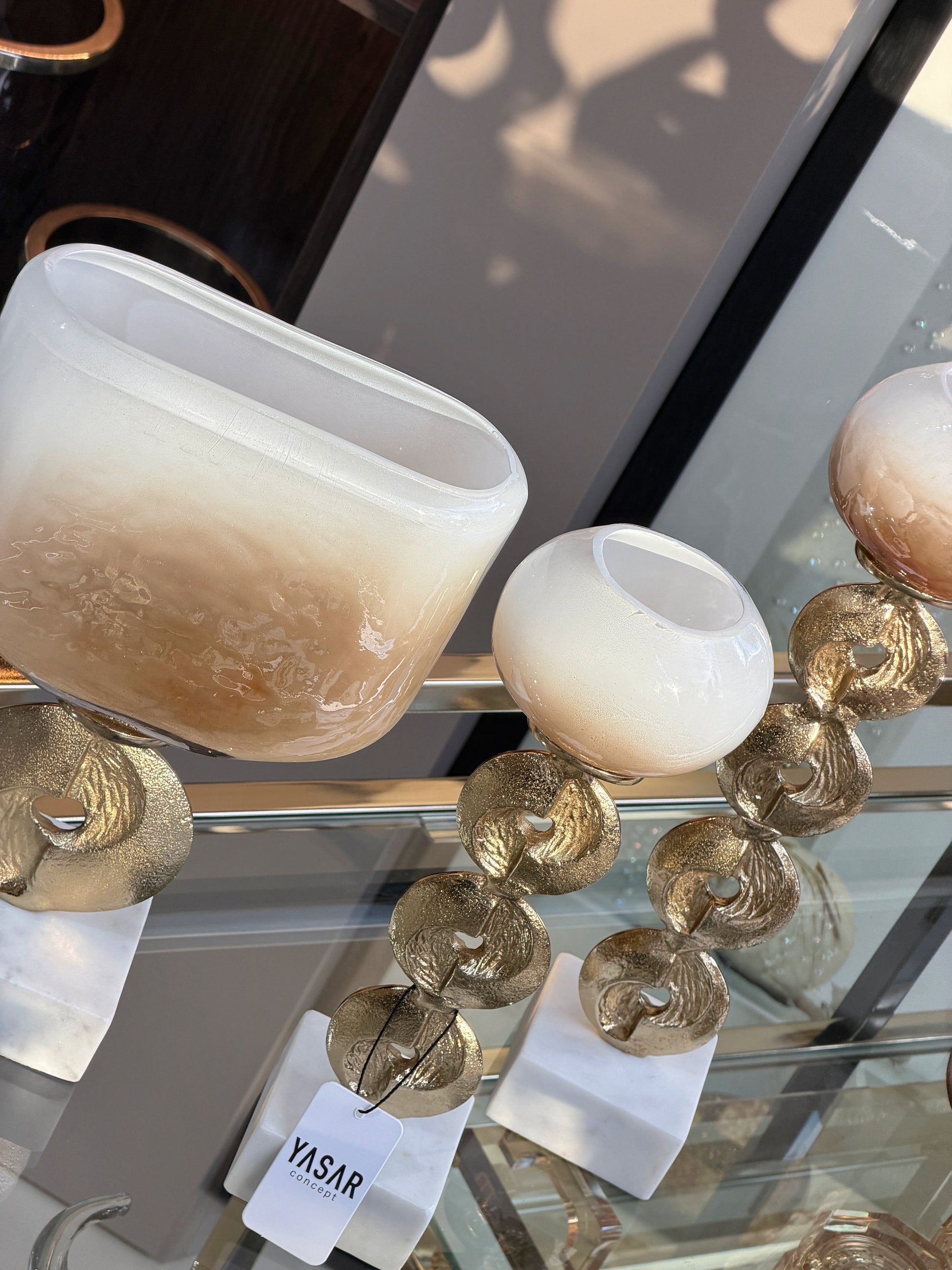 Dairesel formlu metal halkalar, ürünün sanatsal dokusunu oluştururken, üst kısmında yer alan parlak cam detay mum veya tealight kullanımına uygundur. Dekoratif şamdan seti ve vazo olarak hem işlevsel hem estetik olan bu ürün, davet sofralarınızda ya da günlük kullanımda göz alıcı bir tamamlayıcı parça sunar.