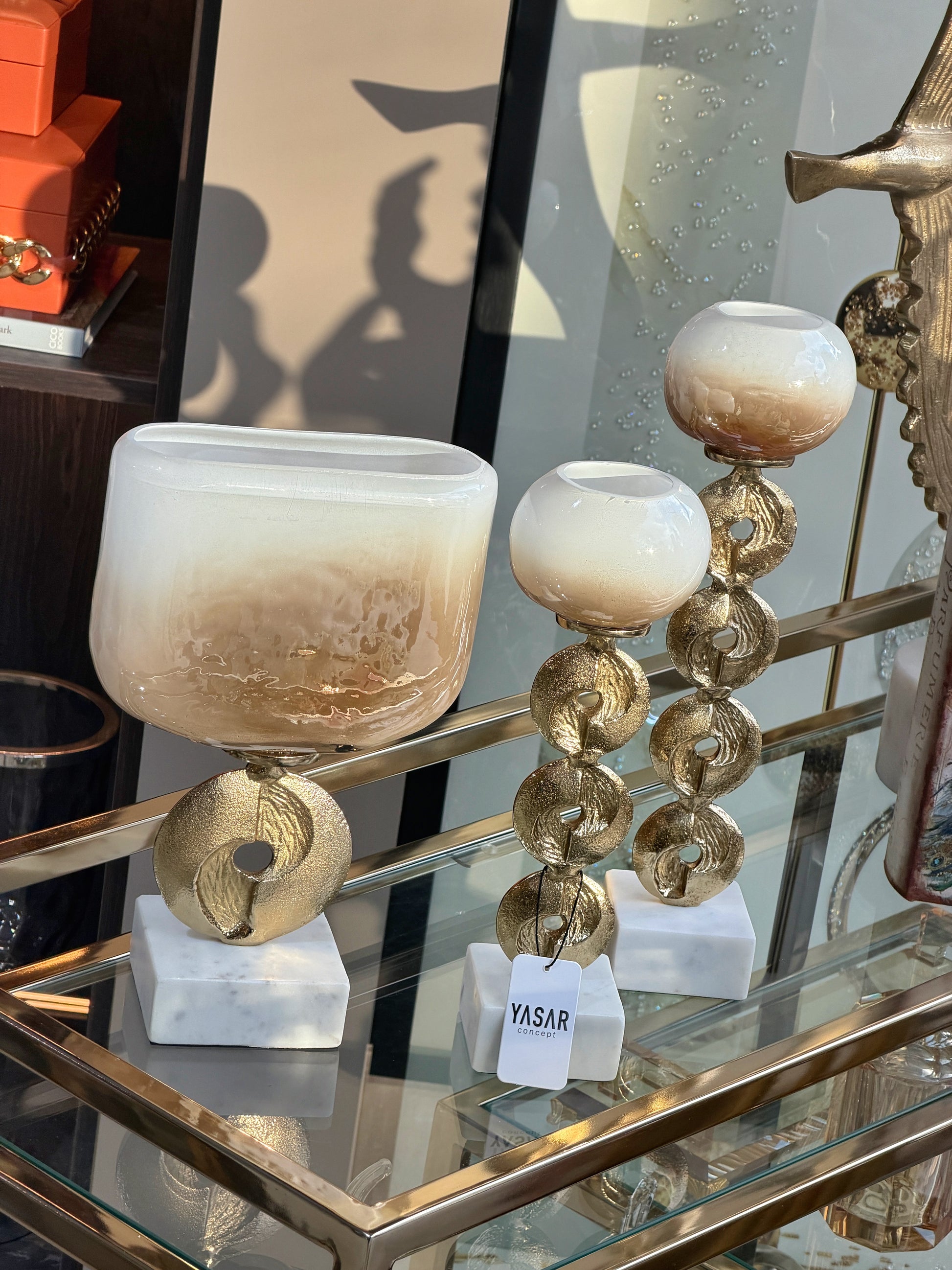 2’li Lustrina Şamdan ve Vazo, altın renkli halkalı gövde formu, mermer beyaz kaidesi ve cam detaylı üst kısmıyla dekorasyona güçlü bir lüks etkisi kazandırır. Modern ve gösterişli çizgileriyle dikkat çeken bu şamdan seti, masa üstü, konsol, sehpa veya yemek masalarında şık ve dengeli bir simetri sağlar.