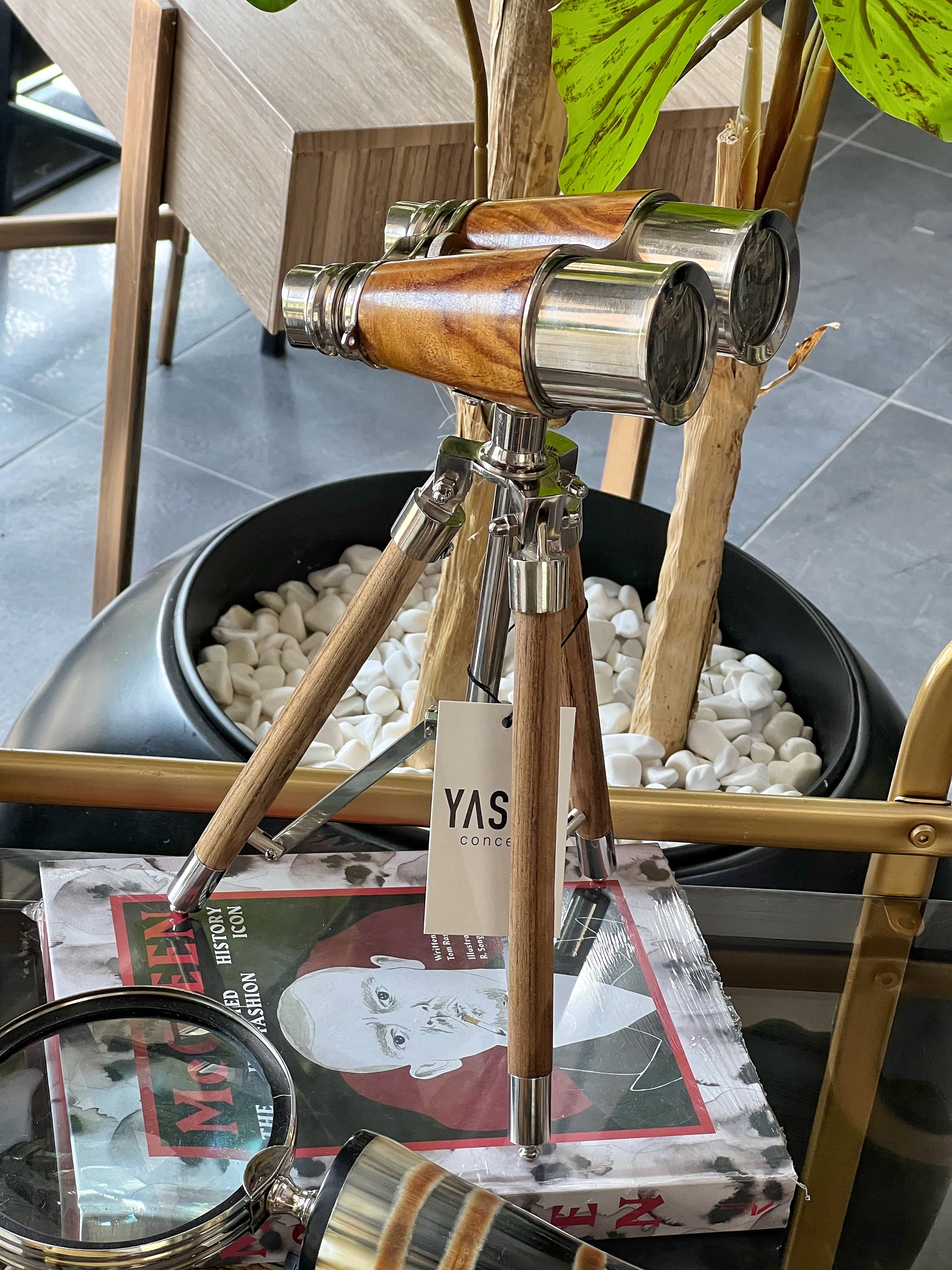 Ofis, kütüphane, çalışma odası ya da salonlarda sehpa ve konsol üzerinde lüks dekoratif obje olarak kullanılır. Duruşuyla ilgi çeken bu dürbün, ayaklı dekoratif obje arayanlara nostaljik ve stil sahibi bir seçenek sunar.